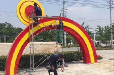 鼓楼烤漆拱门雕塑,彩虹图案设计,不锈钢大门雕塑实景